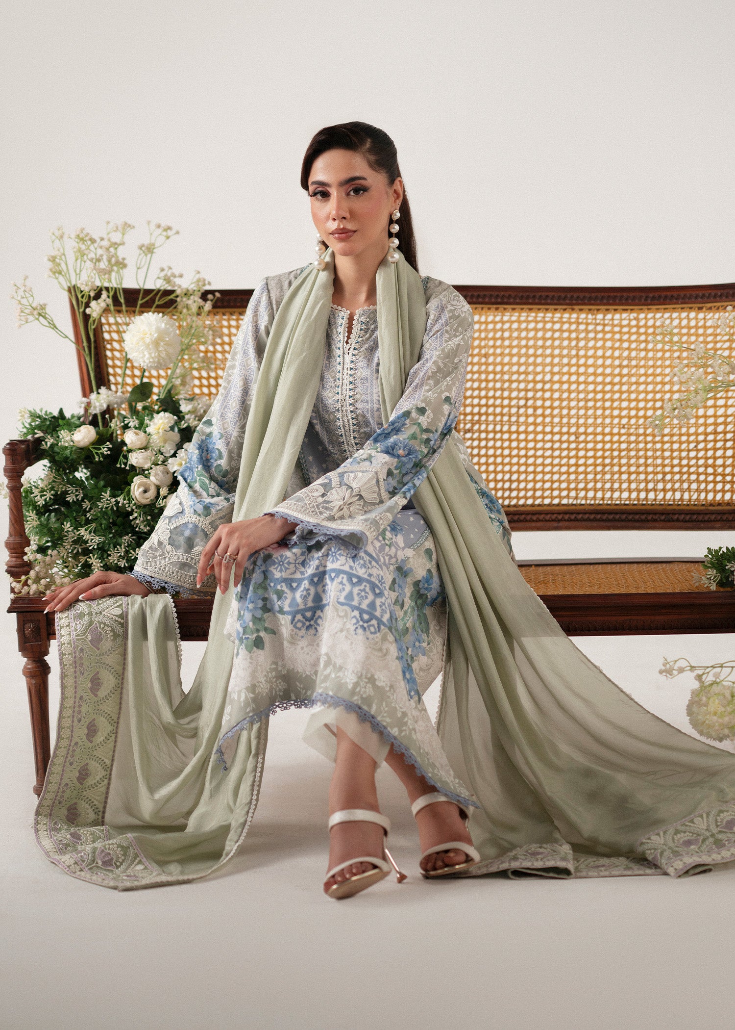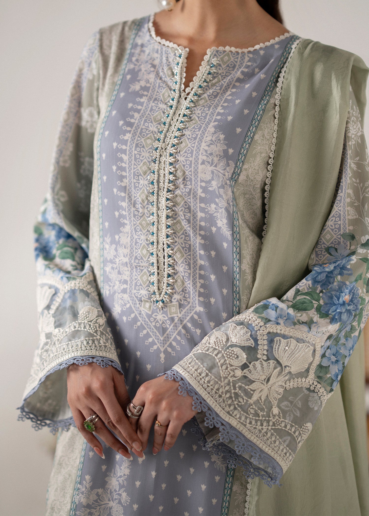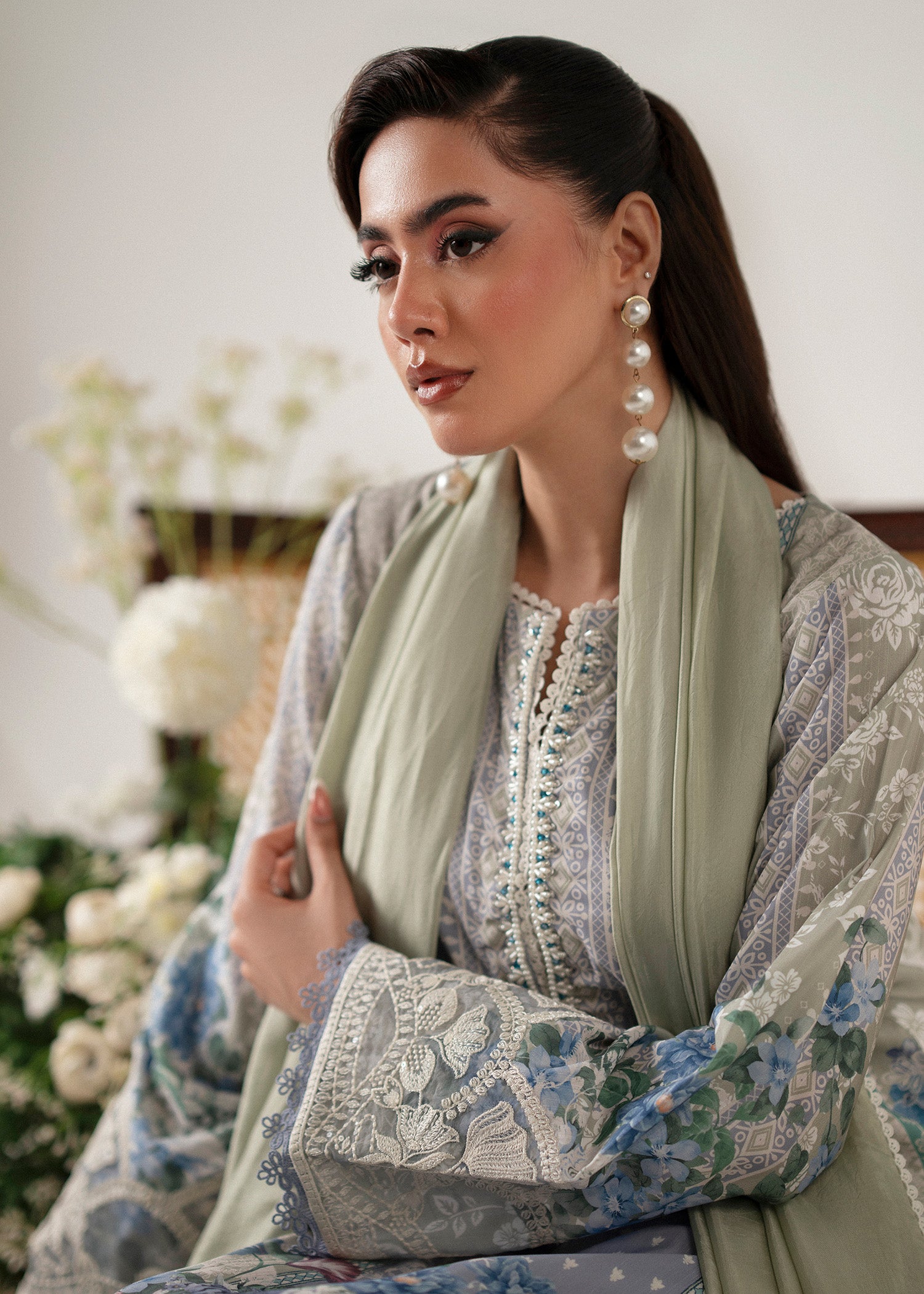 The neckline is delicately embellished with intricate handwork, adding an artisanal touch to the refined aesthetic. Paired with a silk dupatta adorned with elegant embroidery and lace details, and completed with tailored trousers, Bluebell is perfect for sunny days and sophisticated summer occasions.