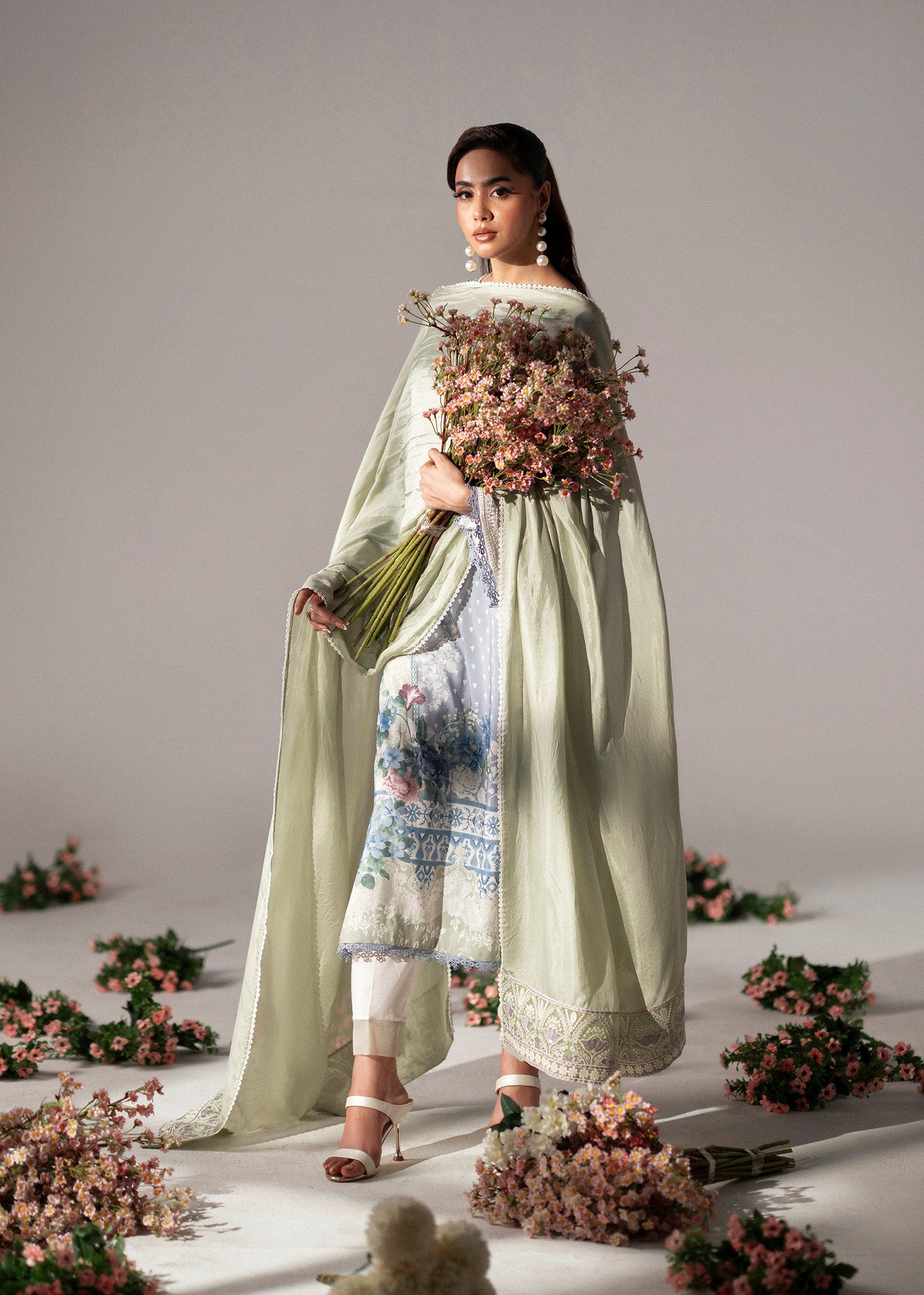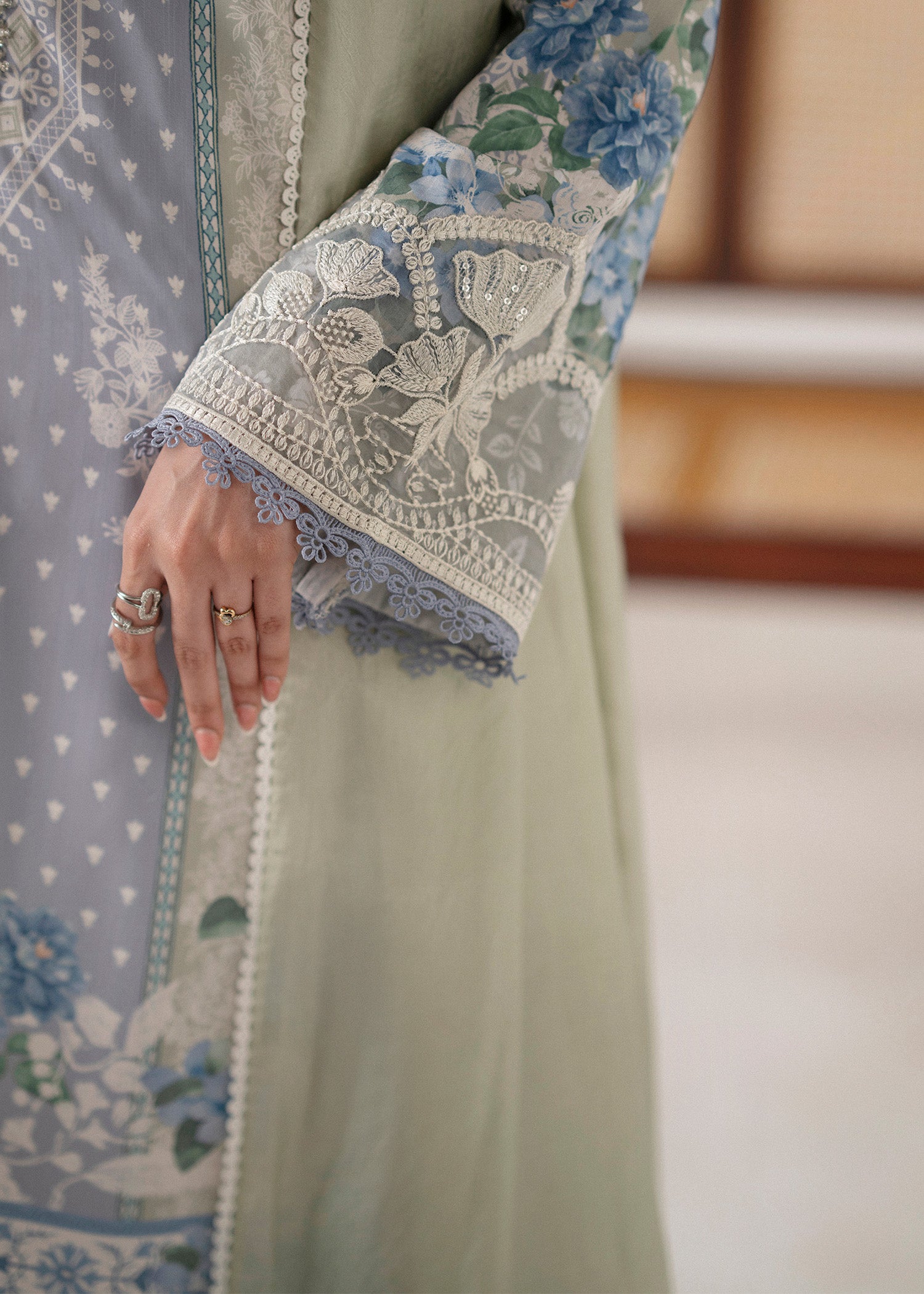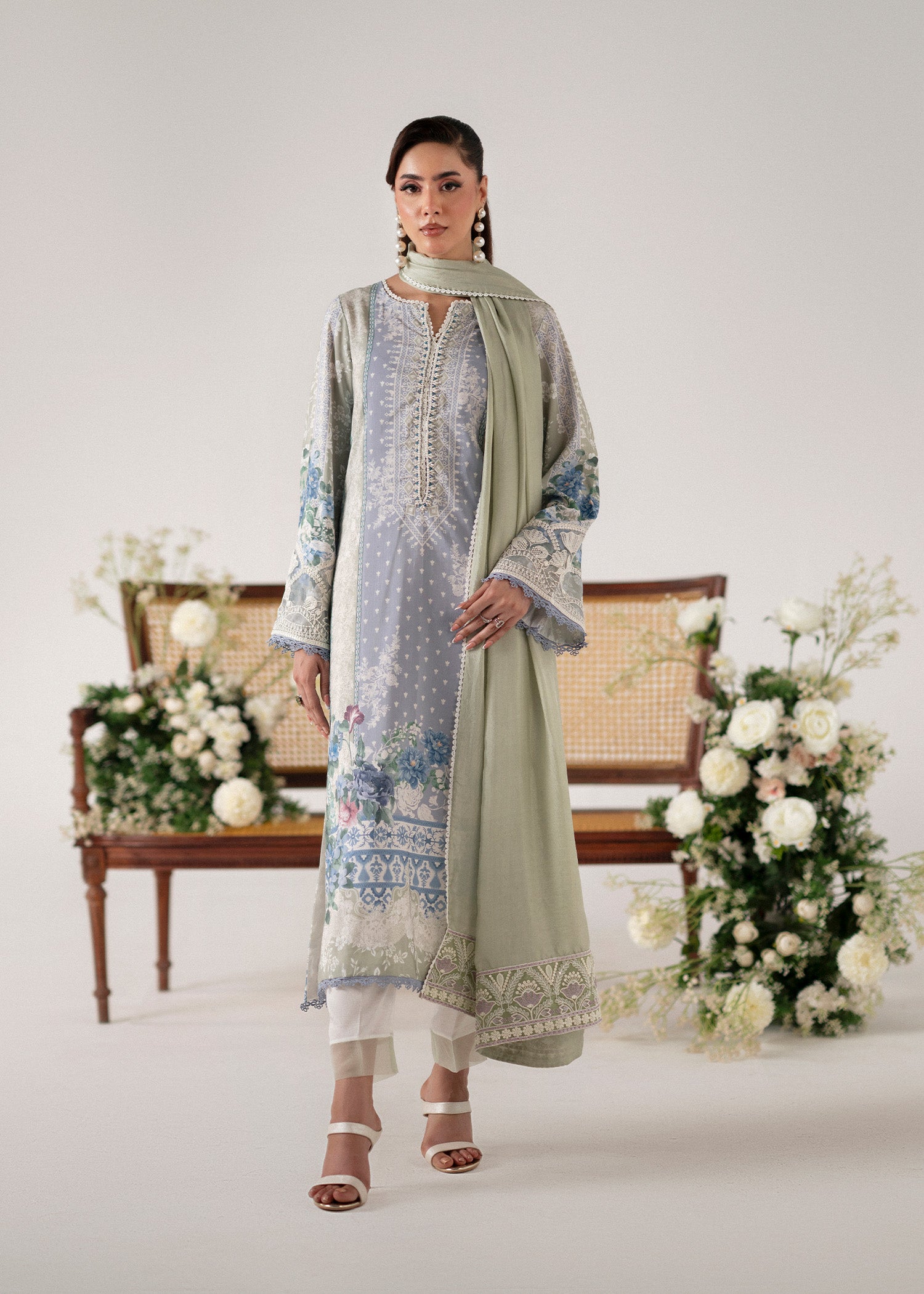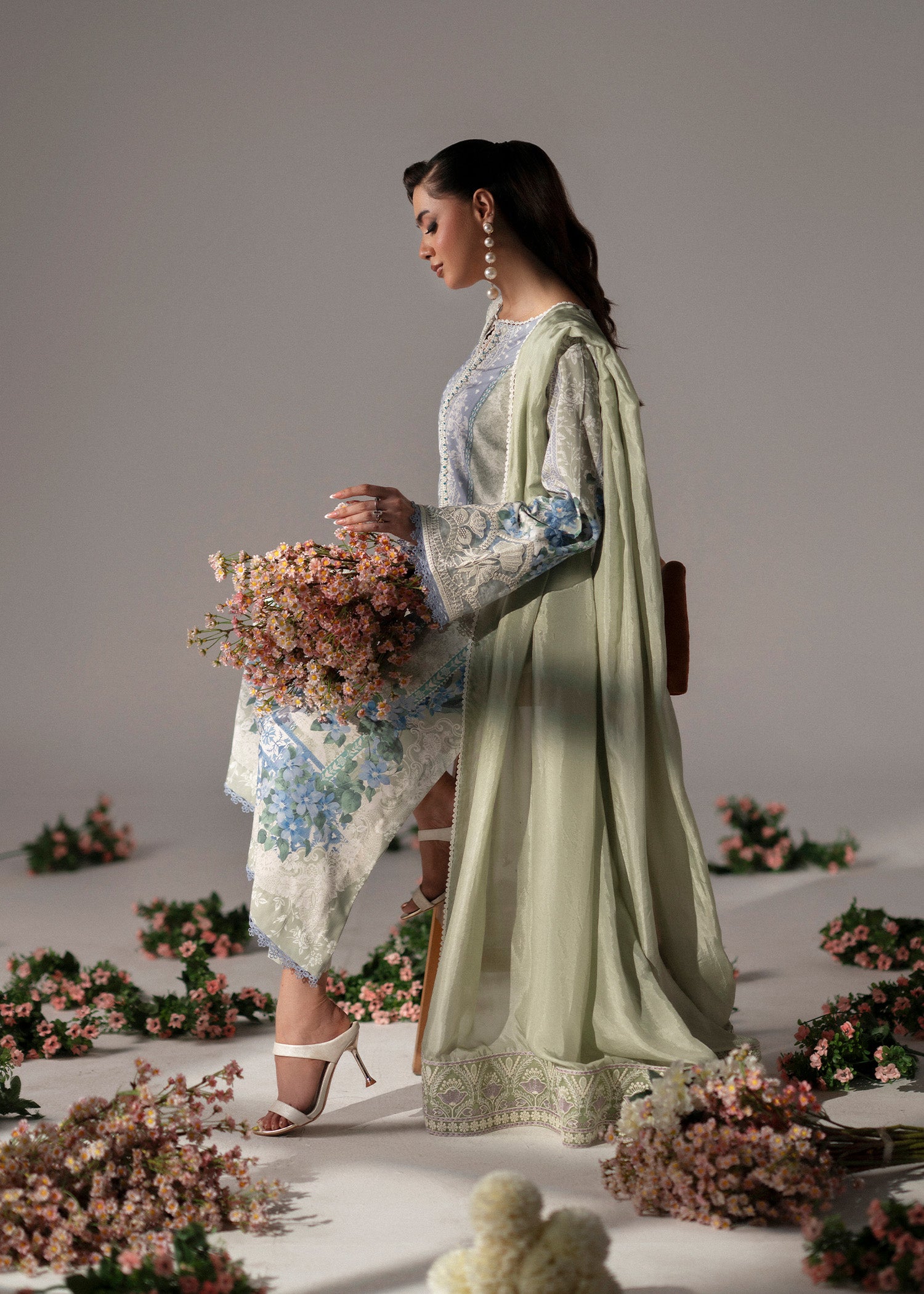 The neckline is delicately embellished with intricate handwork, adding an artisanal touch to the refined aesthetic. Paired with a silk dupatta adorned with elegant embroidery and lace details, and completed with tailored trousers, Bluebell is perfect for sunny days and sophisticated summer occasions.