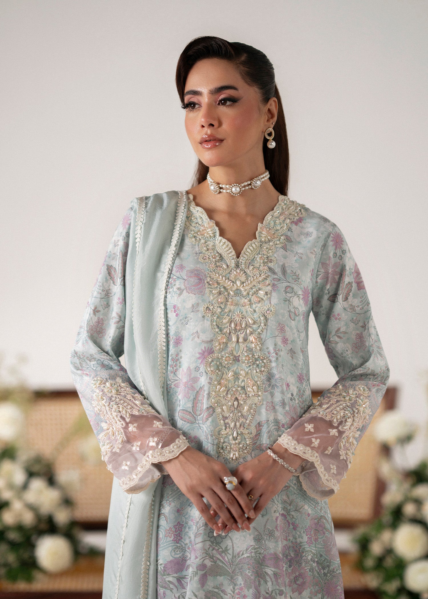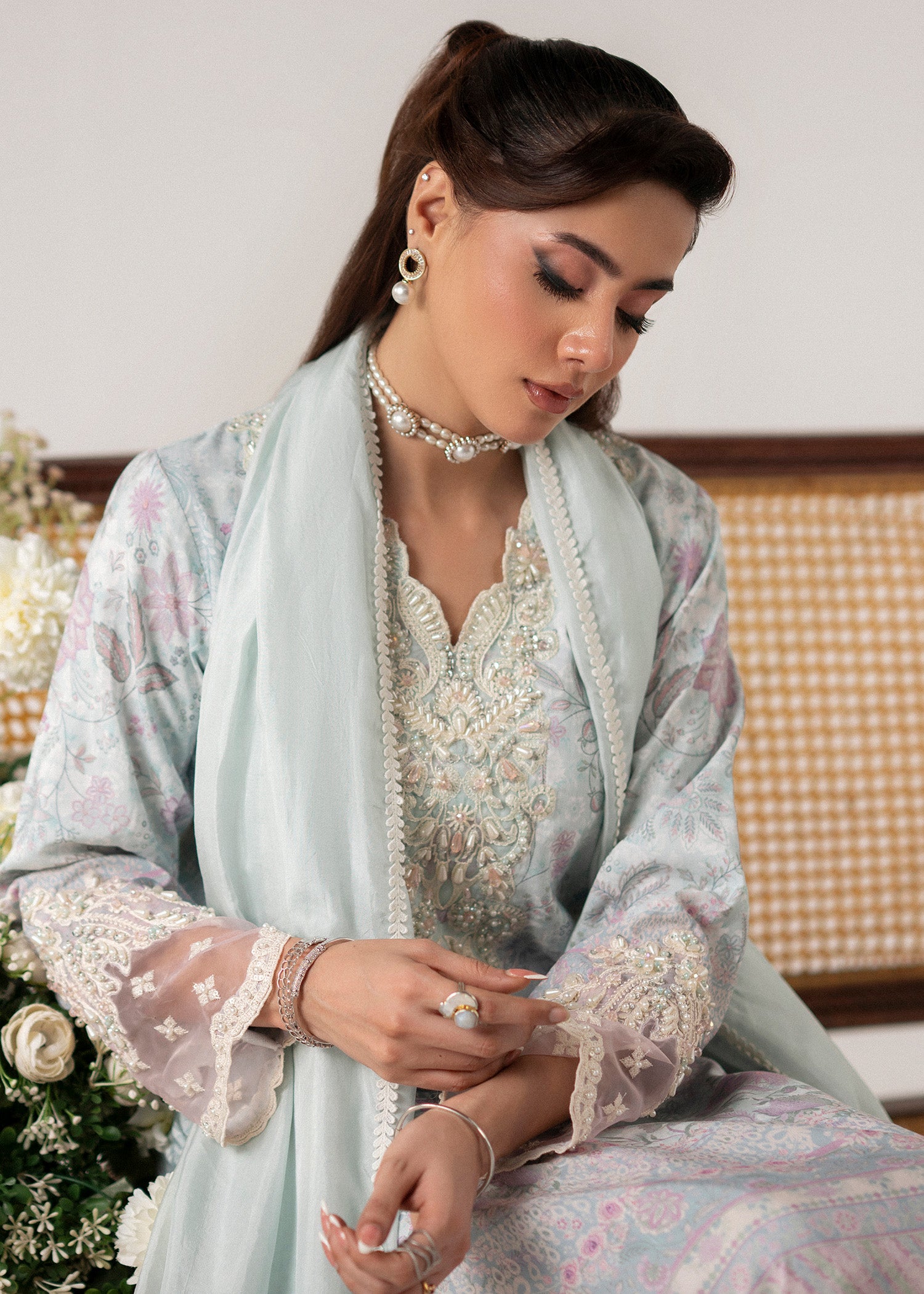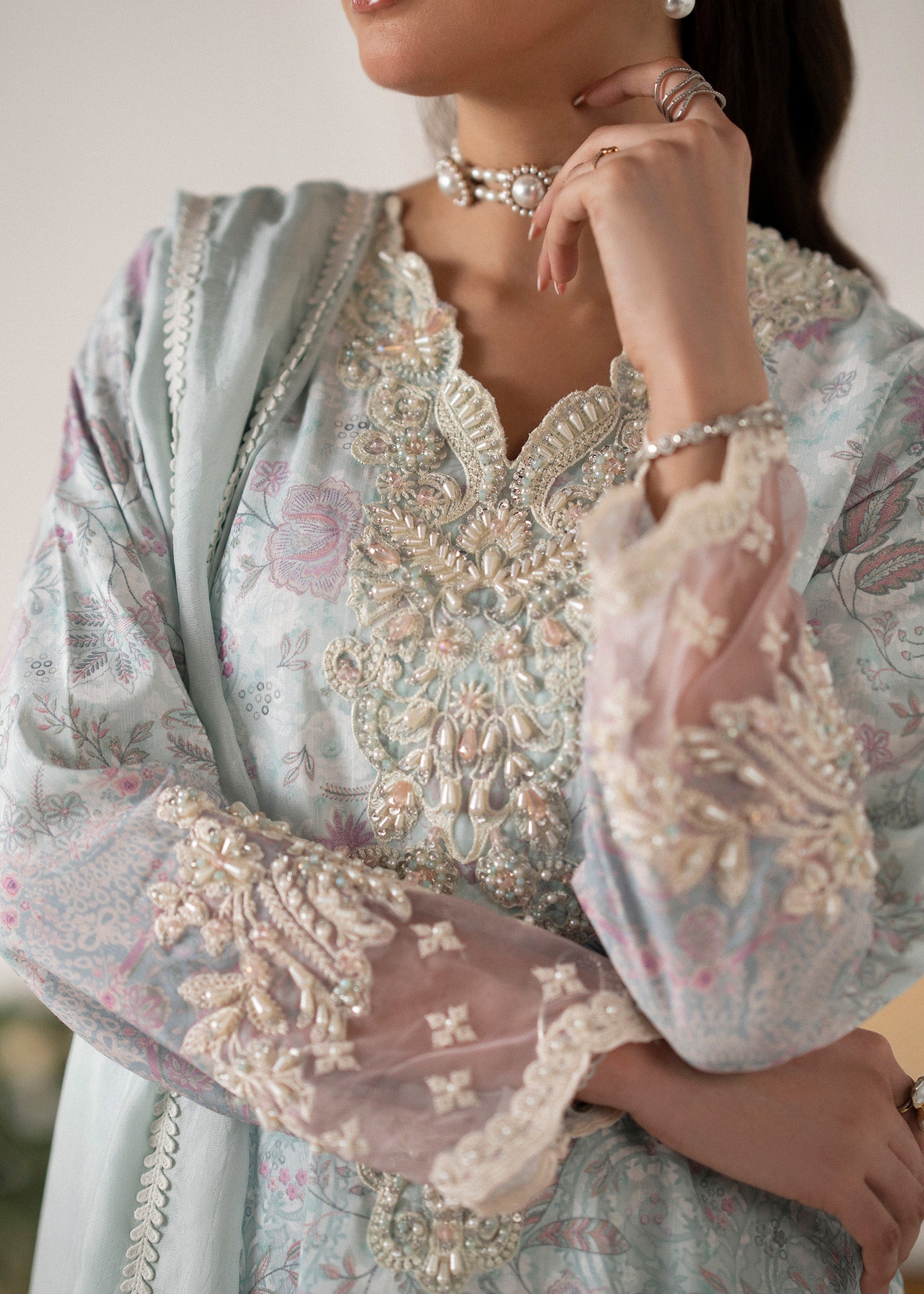 The neckline is elevated with fine embroidery and hand-worked detailing, while the sleeves feature graceful accents that add a touch of charm. Paired with a luxurious silk dupatta adorned with intricate embroidery and finished with delicate lace trims, Icelyn is a timeless choice for those who love refined, feminine style.