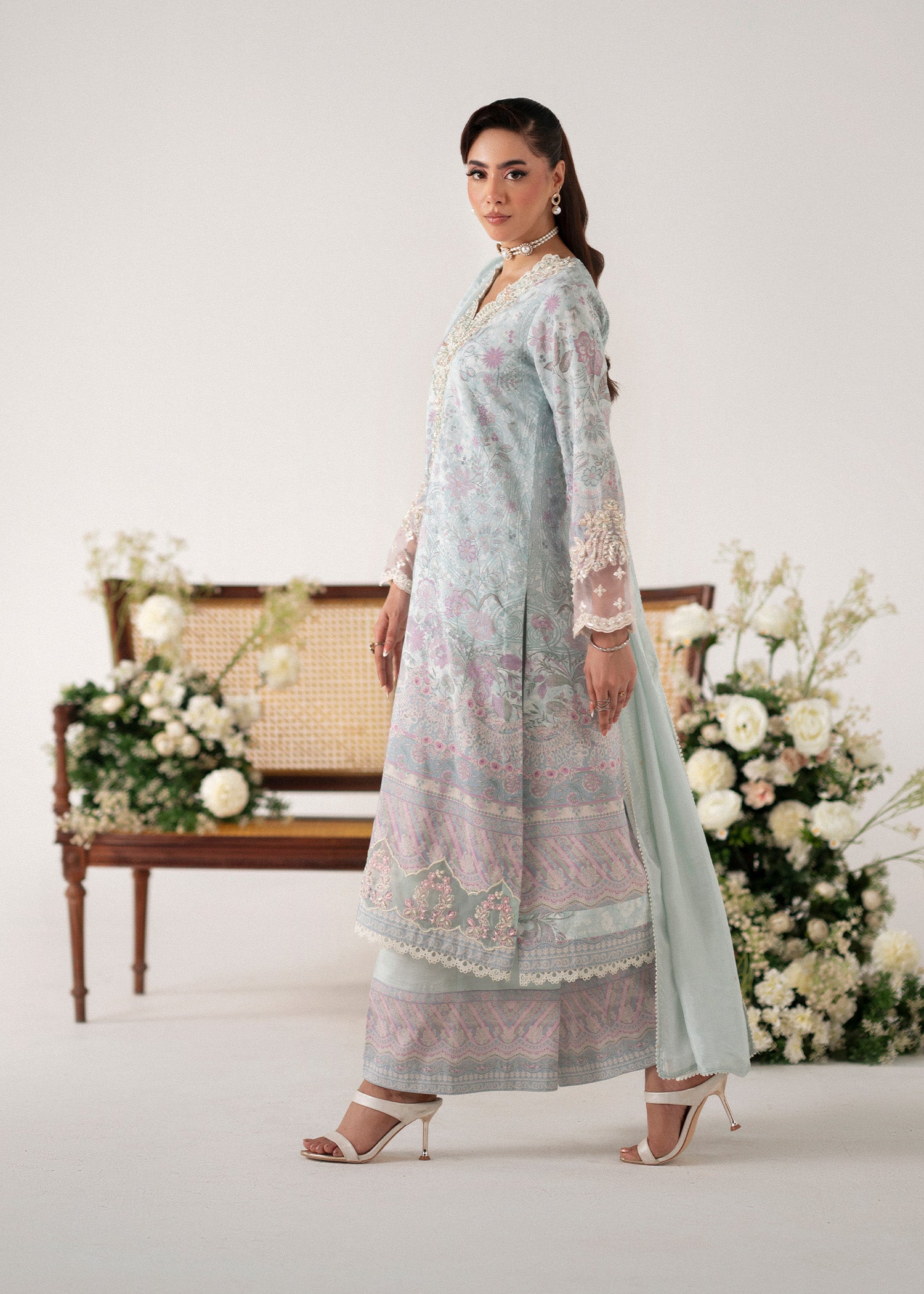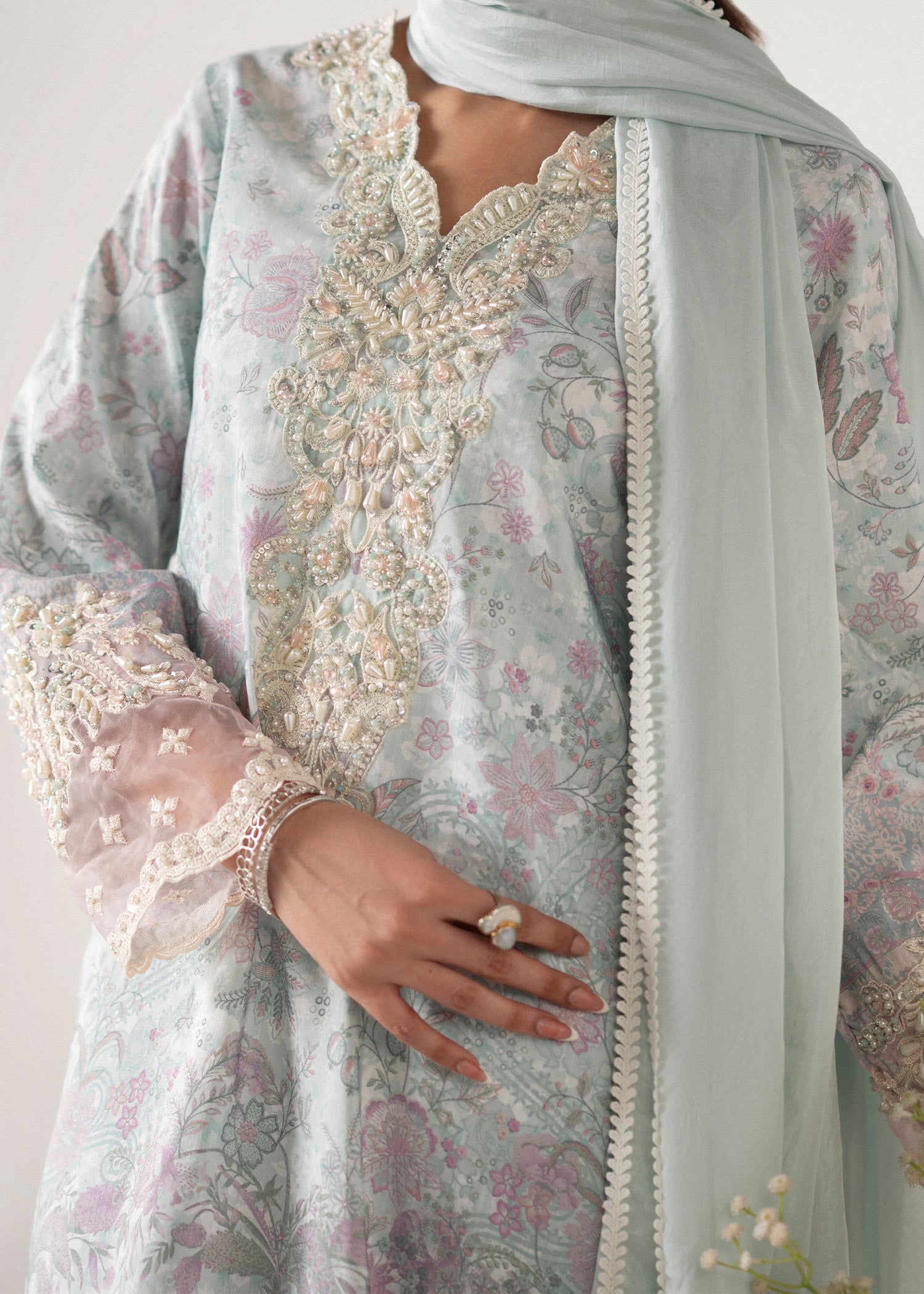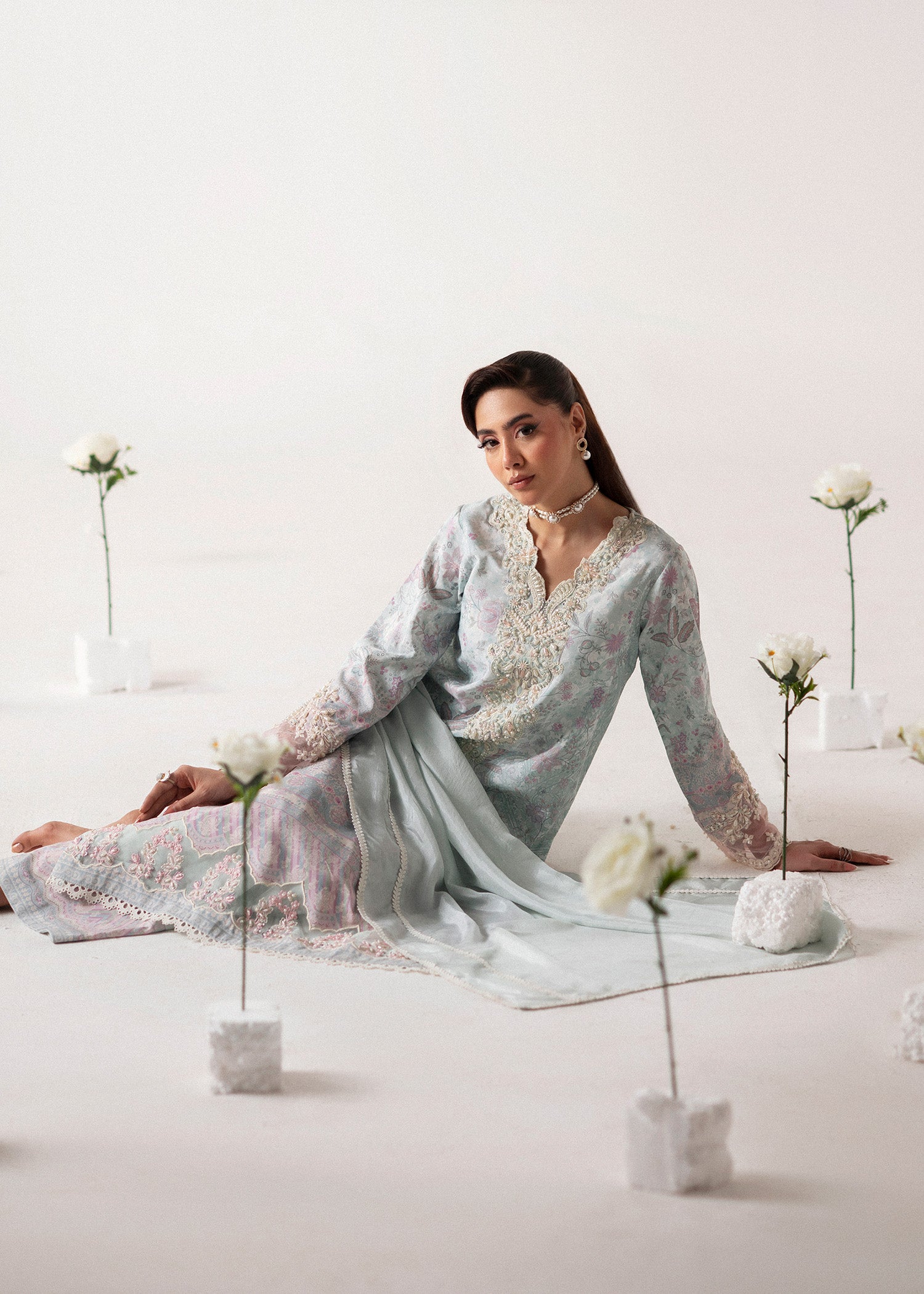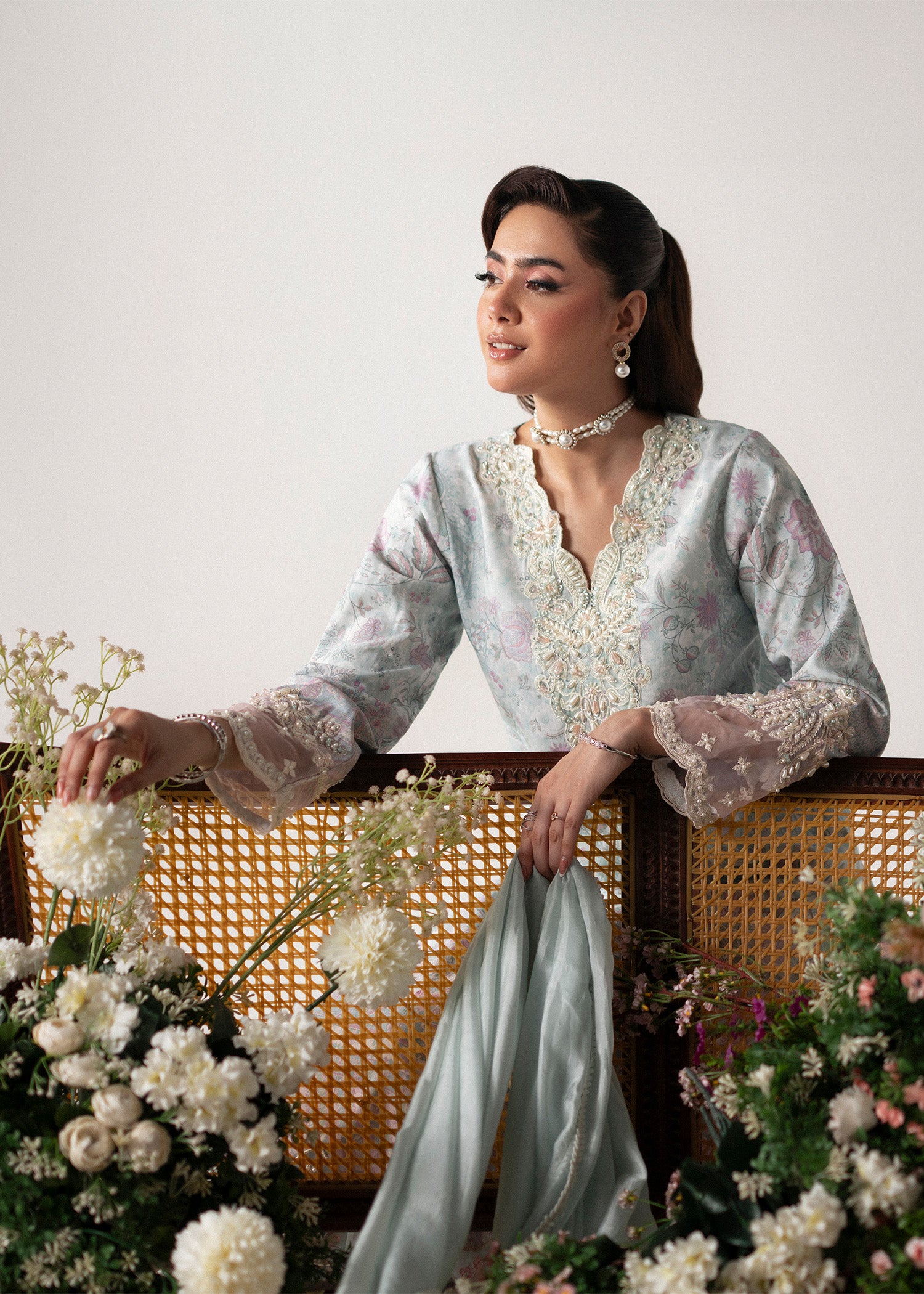 The neckline is elevated with fine embroidery and hand-worked detailing, while the sleeves feature graceful accents that add a touch of charm. Paired with a luxurious silk dupatta adorned with intricate embroidery and finished with delicate lace trims, Icelyn is a timeless choice for those who love refined, feminine style.