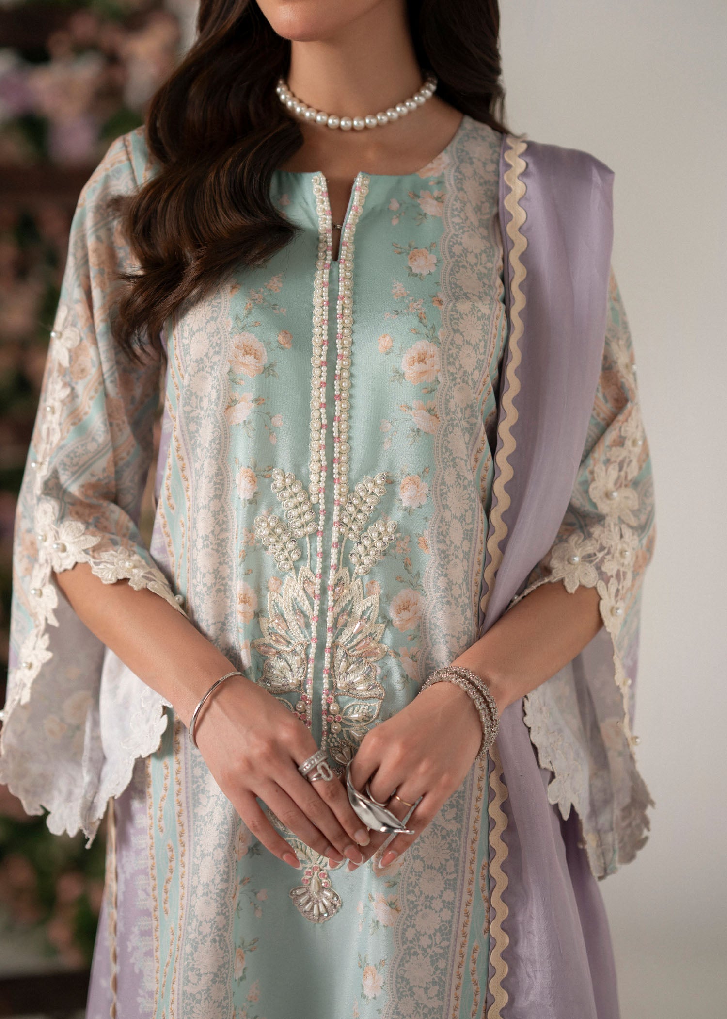 The neckline is delicately embroidered, adorned with intricate handwork that adds a touch of artisanal finesse. Paired with a luxurious silk dupatta, detailed with graceful embroidery and lace accents, Roselle is a celebration of subtle beauty and timeless style — ideal for both day festivities and evening elegance.