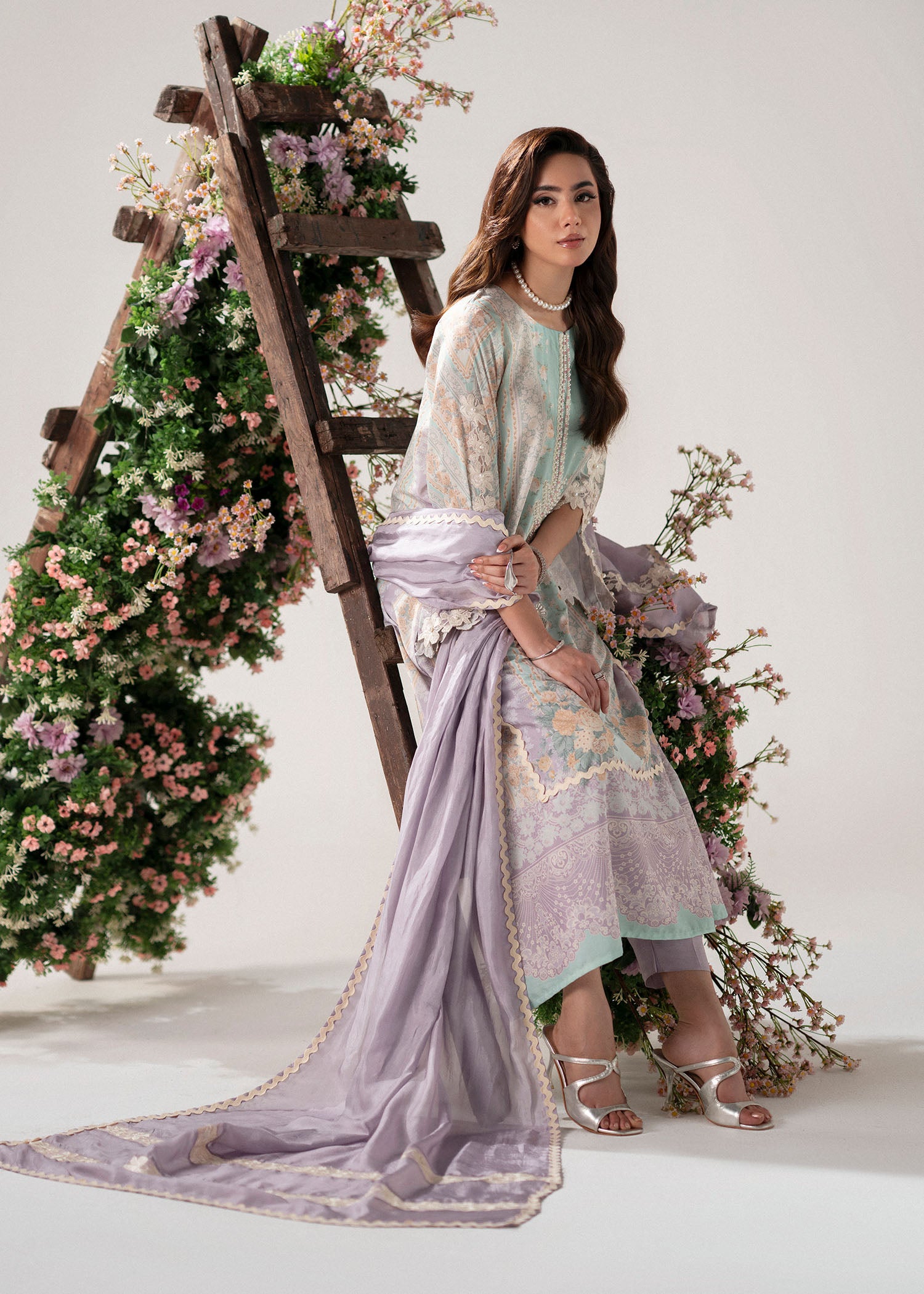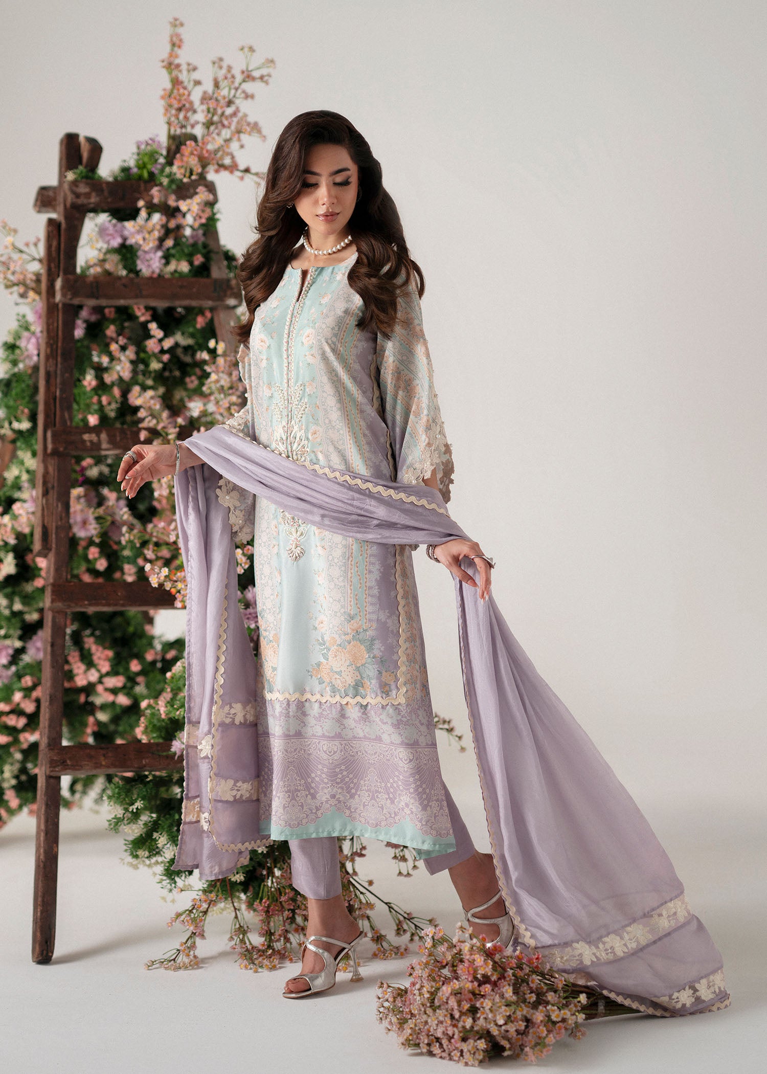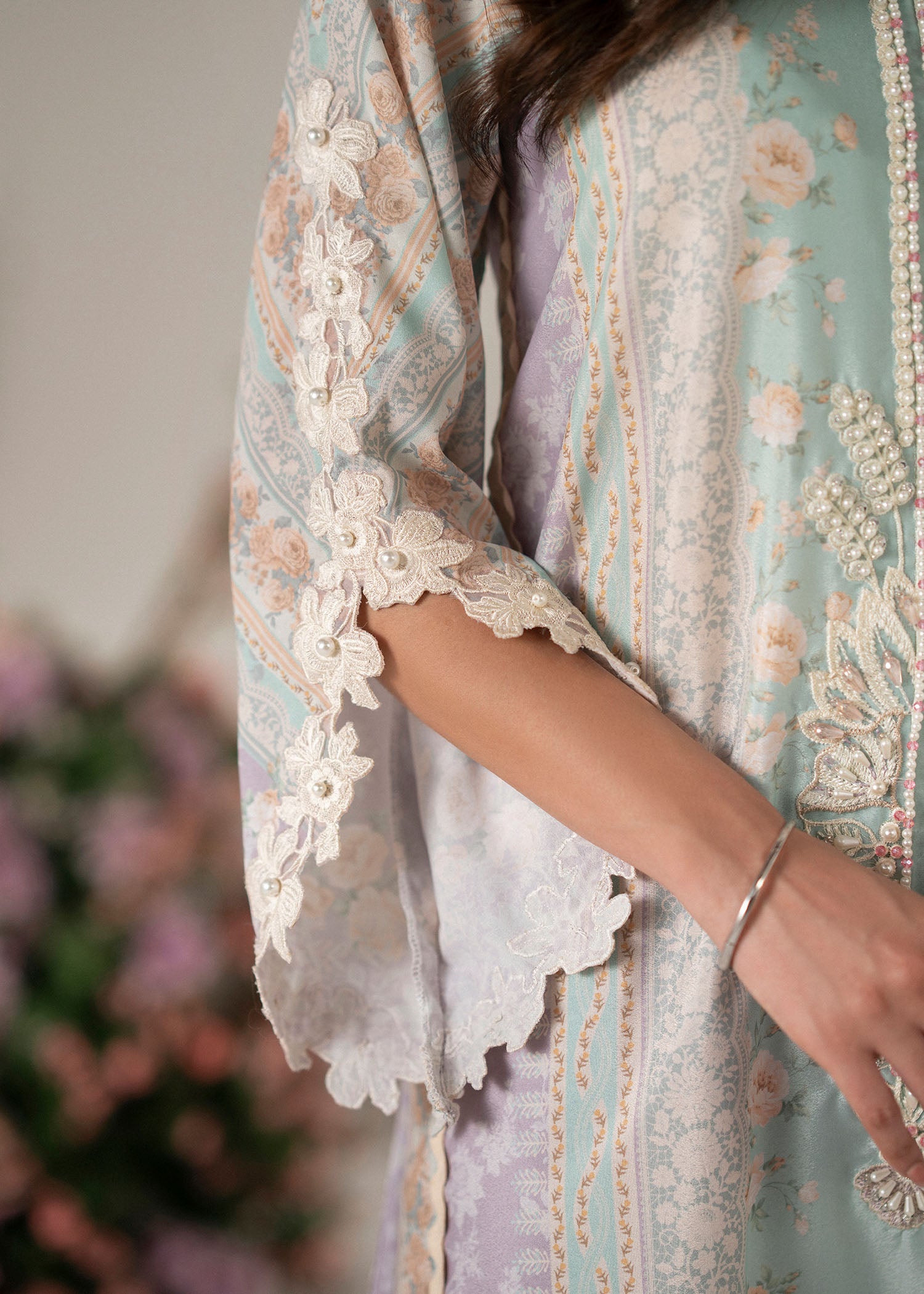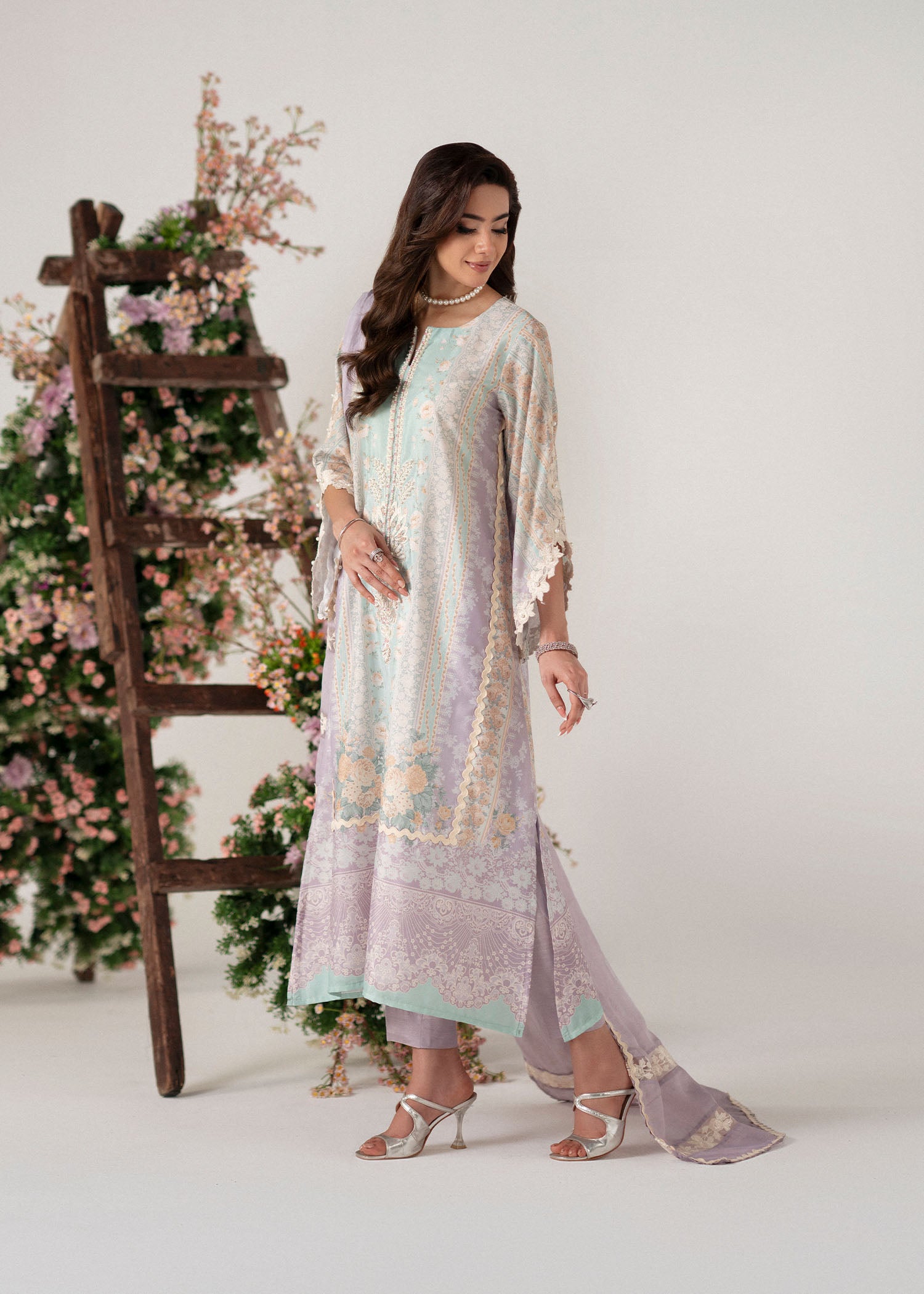 A poetic blend of modern elegance and floral charm, Roselle captures the spirit of understated sophistication. The outfit features a composed print in soothing shades of lilac and mint, evoking a soft, dreamy palette perfect for refined tastes.